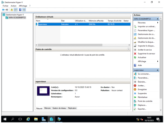 Nous avons déployé le rôle Hyper-V sur notre serveur afin d’y héberger une machine virtuelle Windows 10 dédiée à la supervision des postes informatiques.