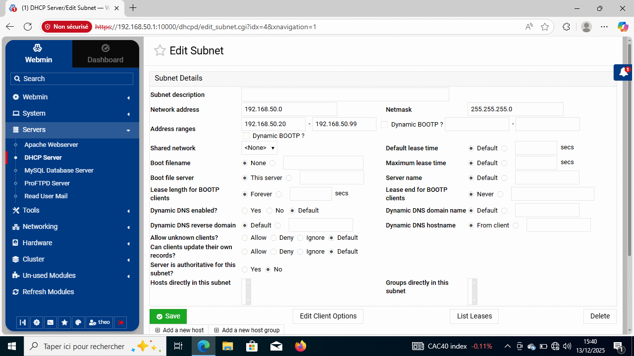 Une fois le serveur DHCP opérationnel et la communication établit entre la machine virtuelle Windows cliente et le serveur, j’ai pu gérer le service DHCP de manière graphique. Au moyen d’une interface web.